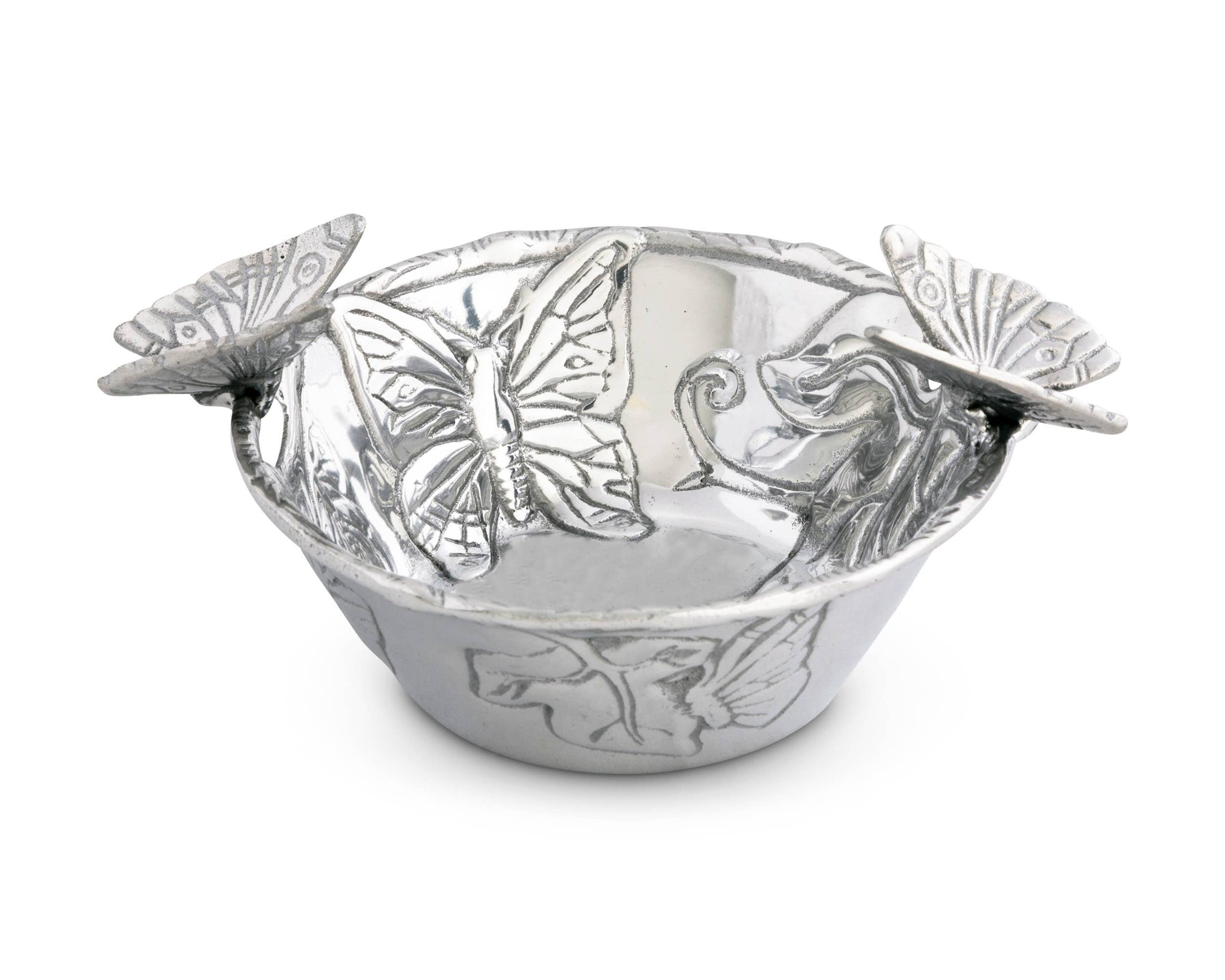 Great for entertaining, this Arthur Court Butterfly Nut Bowl features a beautiful deep dish design and a high polished finish, with butterflies alighted on each side of the rim. Inspired by summer gardens, this piece will bring a smile to your guests' faces all year 'round when you set it out, filled with nuts or candy. Elegant butterflies display inside this dish as two of their companions try and lift them to safety by the handles. The brilliant luster of this handmade, aluminum design highlights each insect's detailed wings. Size: Diameter: 6.0" / H: 3.75" Care: Wash by hand with mild dish soap and dry immediately - do not put in dishwasher.