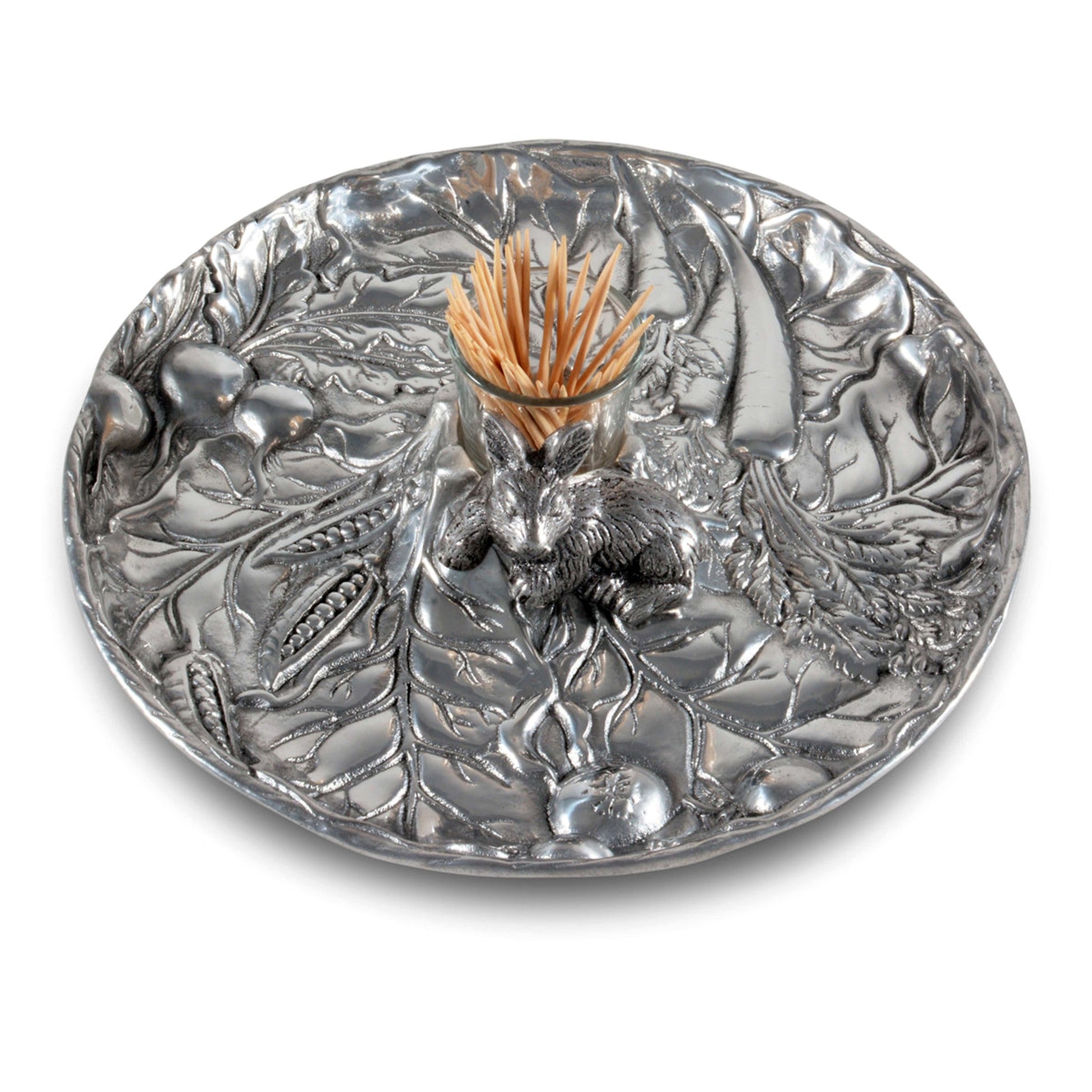 A sweet, Arthur Court Bunny rests on a bed of cabbage leaves surrounded by garden delights creating the Arthur Court Rabbit Garden Tidbit Tray. Bas-relief design includes carrots, pea pods, tomatoes and radishes, the resting bunny figure in the middle. Featuring a votive-sized glass holder in the middle, this tray is a stunning way to serve an assortment of crudités, (with carrots of course), nuts, candies or any tidbit collection. The glass holder in the middle will hold picks, hors d'oeuvres forks or even a tealight candle. Size: 10.5" Diameter x 2.5" Tall Care: Hand-wash in warm, soapy water, dry thoroughly. Aluminum tray is not dishwasher safe. Glass votive jar is safe for the dishwasher.