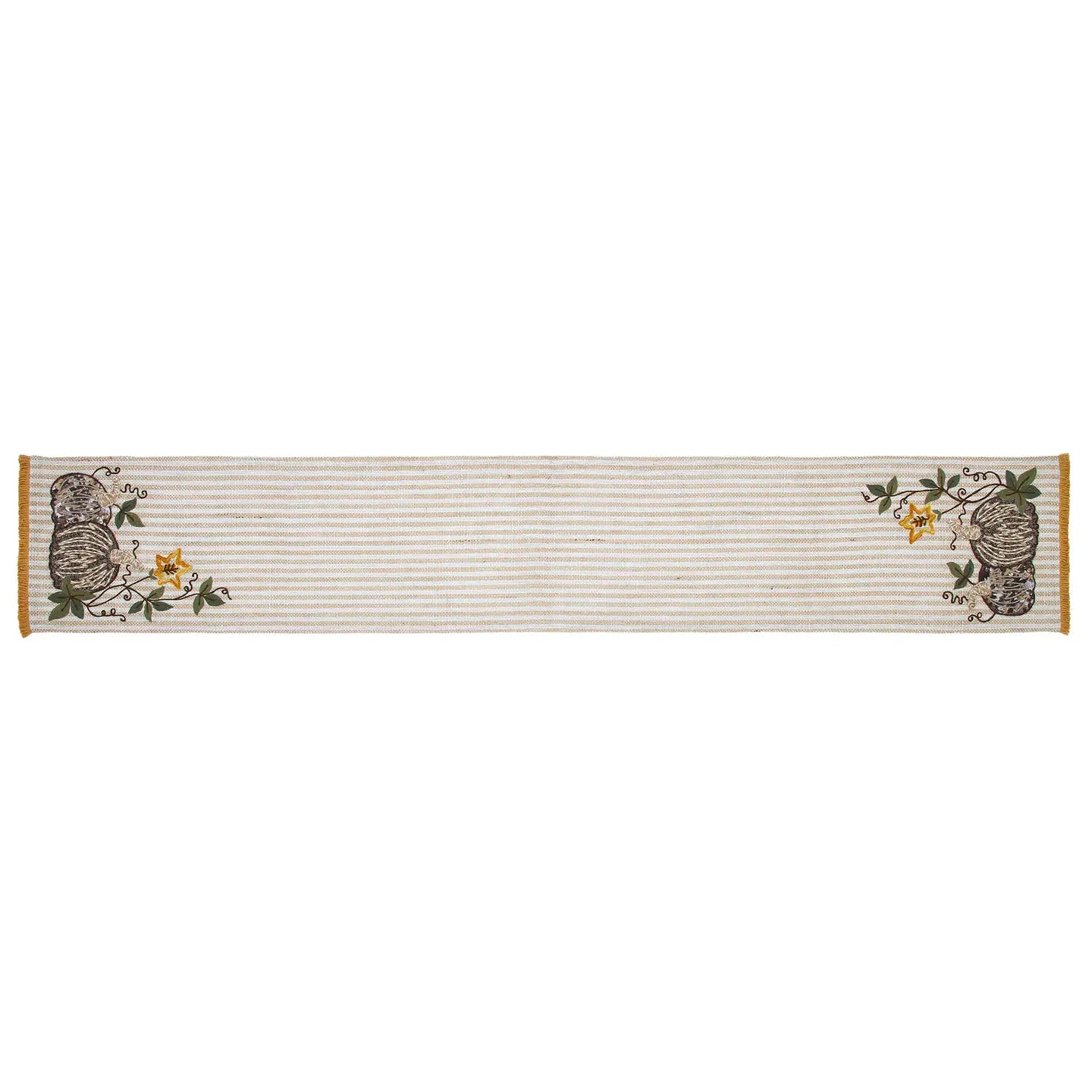 Add a touch of rustic charm to your autumnal decor with the VHC Brands Autumn Pumpkin Patch Stripes Table Runner. Crafted from a blend of jute and polyester, this durable yet elegant table runner measures 12x72 inches, making it the perfect addition to your kitchen or dining room for fall and Thanksgiving celebrations. Its rectangular shape fits most table sizes, while the spot-clean design ensures easy maintenance, allowing you to enjoy its beauty year after year. Featuring a delightful pumpkin patch motif, this table runner captures the essence of the fall season with its charming embroidered design. The warm hues of light tan, creme, and marigold yellow complement any country-inspired decor, adding a cozy and inviting atmosphere to your dining space.