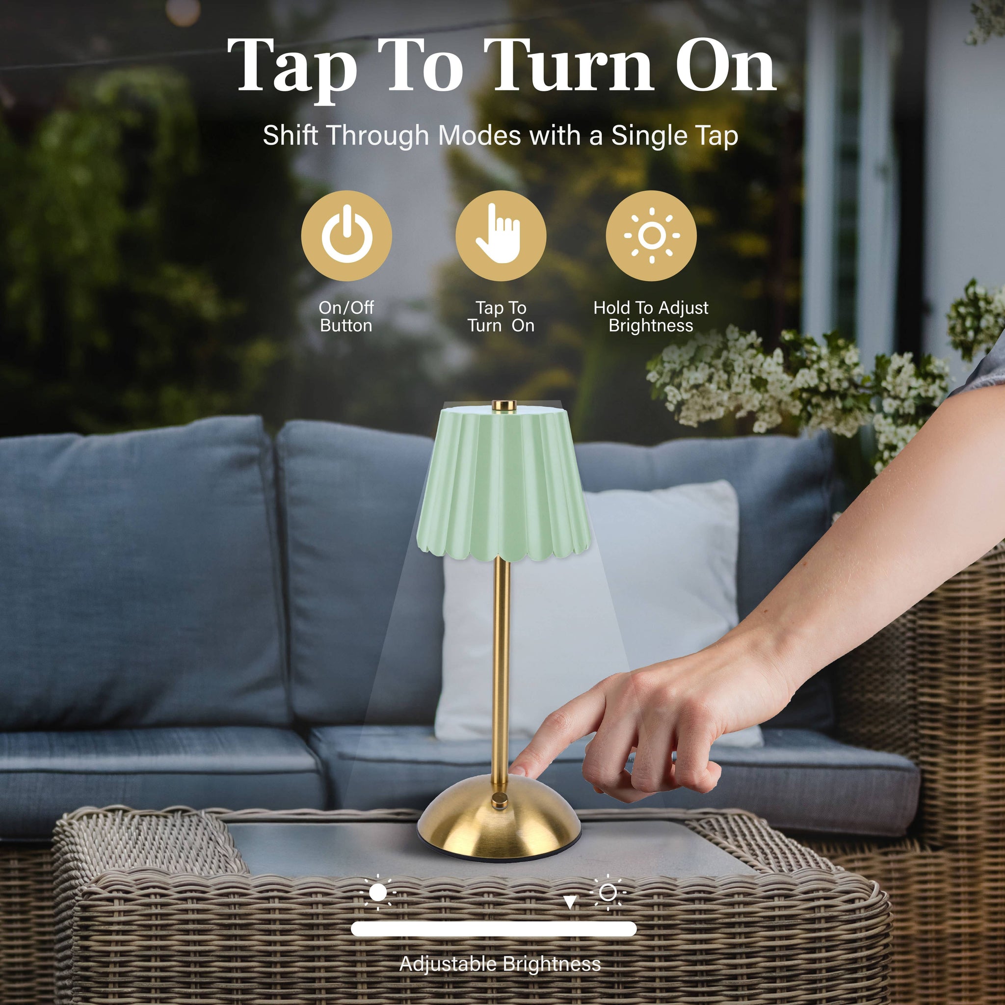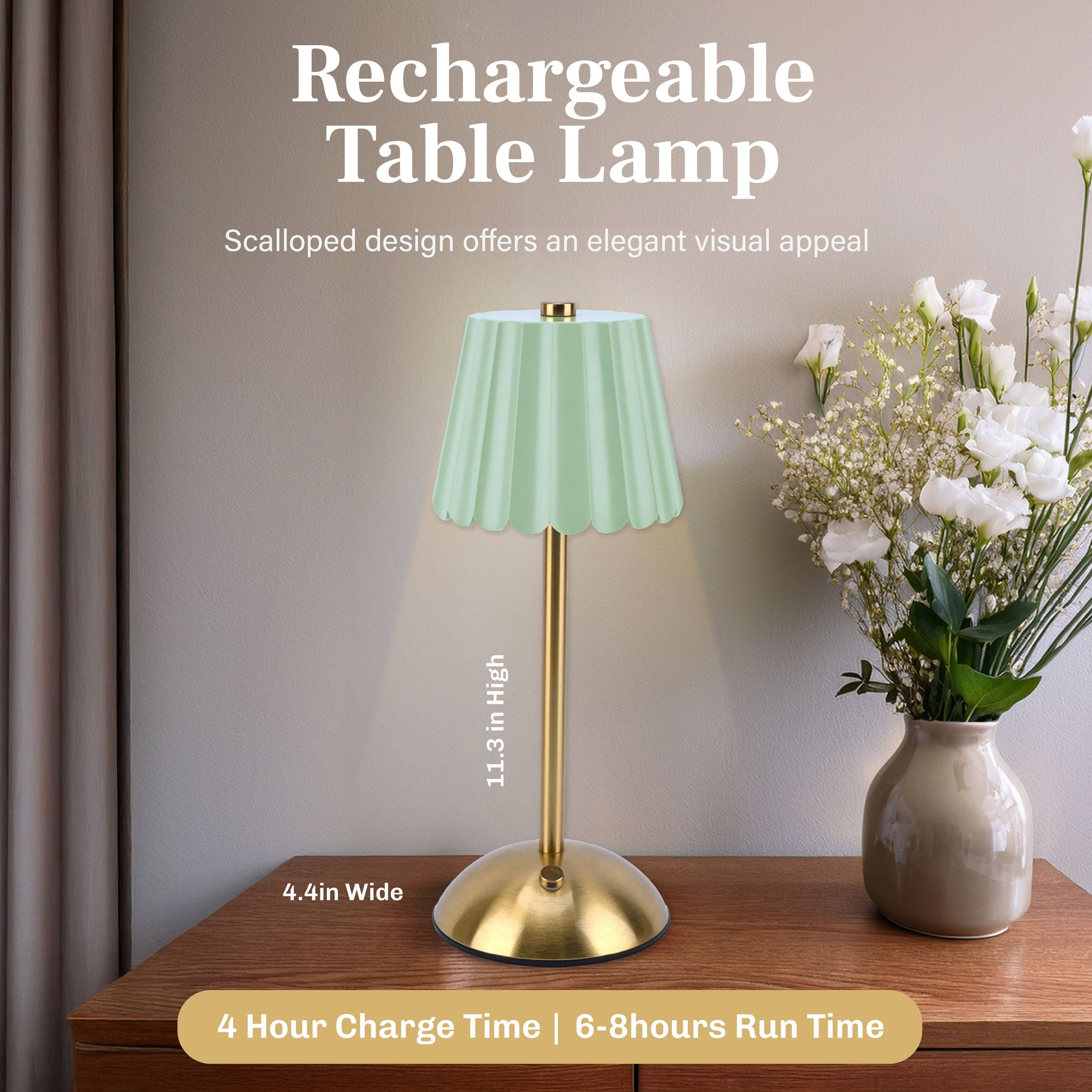 Bring timeless style and modern convenience to any space with the Bell + Howell Rechargeable Table Lamp featuring a scalloped design. This portable LED lamp combines elegance with functionality. Measuring 11.3" x 4.4", it includes 3 dimmable light modes: warm, natural, and white light, all controlled with a simple tap or press. The rechargeable design ensures portability, making it perfect for dining tables, home offices, restaurants, or cozy living spaces. Lightweight yet durable, this cordless lamp delivers long-lasting illumination for versatile use throughout your home or workplace.
