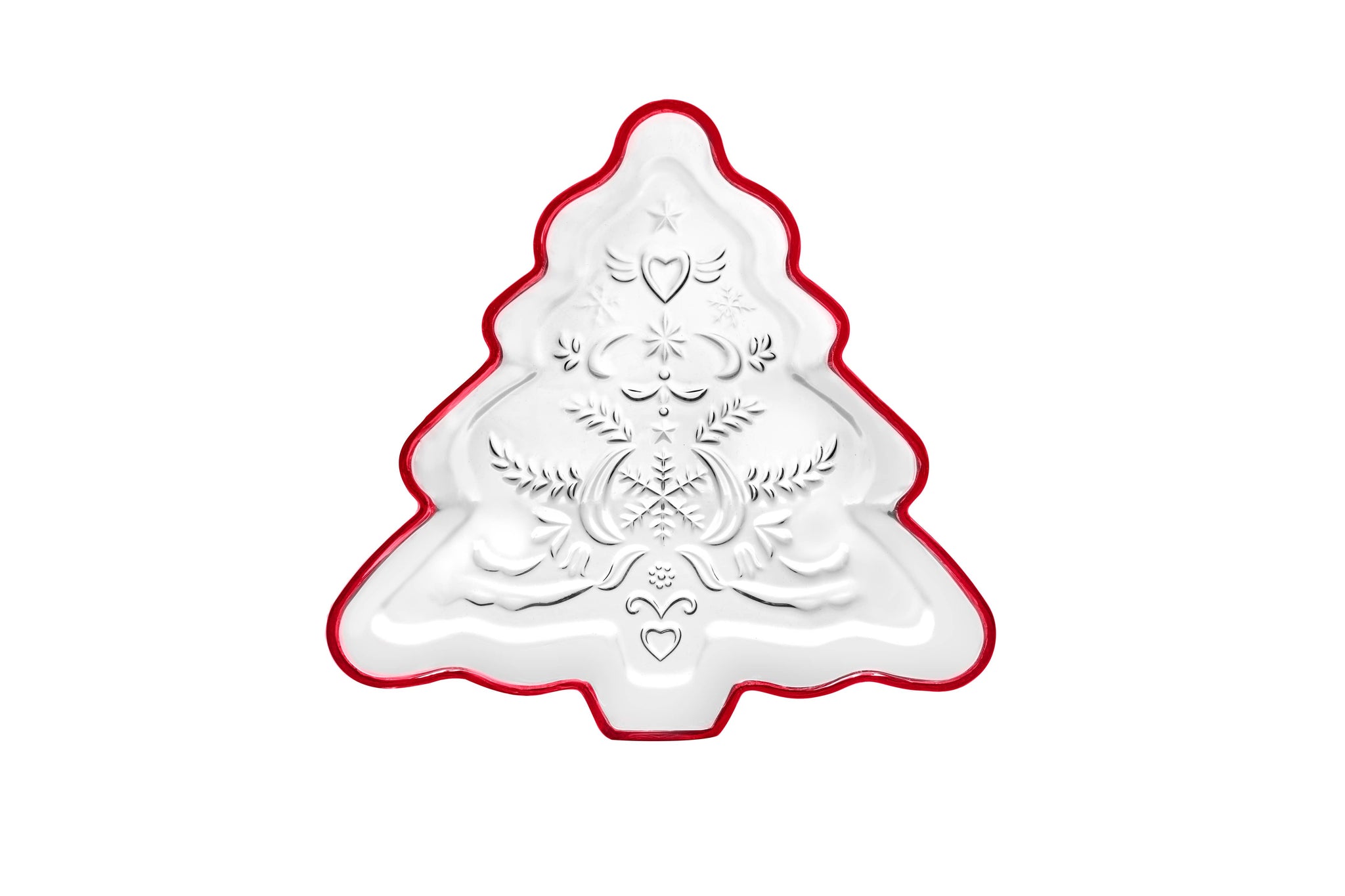 This decorative Christmas Tree Serving Tray features a festive red trim. The Christmas Tree Serving Tray is perfect for adding a holiday flare to your home. Its elegant design ensures a timeless classic look that will last through the years. Semi-Handmade Imported Material: Unleaded Crystal Color: Red & Clear Overall Dimensions 8.30"L x 8,75"W x 1.0"H General Care Hand-Wash Recommended